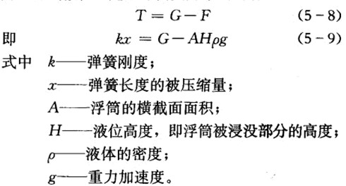 圖5-7所示是一種用壓彈簧平衡浮力,用差動變壓器測量浮筒位移的浮筒式液位計原理示意圖。浸沒于液體中的浮筒,上端通過連桿與彈簧及差動變壓器相連。這樣,浮筒除了受自身重力G、液體的浮力F外,還要受到被拉伸彈簧的拉力T。當(dāng)液位一定,浮筒受力平衡時有