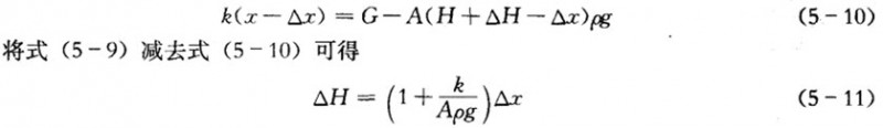 當(dāng)液位變化時,浮筒所受的浮力隨之變化,由于重力不變,要達到新的平衡狀態(tài),浮筒的浸沒高度必然變化,使彈簧的張力也隨之而變。假定某時刻液位升高了△H,如圖5-7 所示,彈簧隨之被壓縮△x.則有