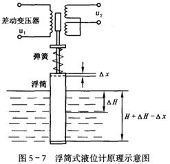 式(5-11)表明,液位的變化量與彈簧的長度變化量成正比。在此,彈簧起到了把大位移△H變成小位移△X的作用。由圖5-7可見,彈簧的長度變化量即是差動變壓器鐵芯的位移量。因此,差動變壓器的輸出反映了液位的高度,即將液位的變化轉(zhuǎn)換成電量的變化。