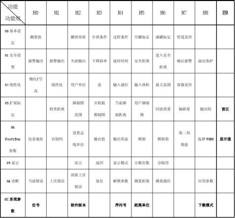參數(shù)設置。在功能中可進行參數(shù)的選擇與存儲,以及數(shù)據(jù)的輸入。“基本設定”功能組可供選擇的功能包括“罐體形狀(002)”,“介質(zhì)特性(003)”,“過程條件(004)”,“空罐標定(005)”等等。 3.1.3 操作矩陣